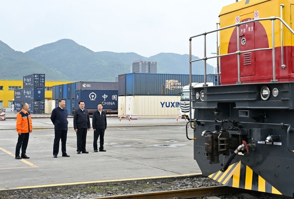 這是4月22日,習(xí)近平在重慶國際物流樞紐園區(qū),了解當(dāng)?shù)丶涌旖ㄔO(shè)西部陸海新通道等情況。