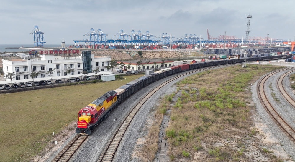 2024年1月19日,滿載東盟國家商品的年貨班列駛出廣西欽州港東站,開往重慶團結(jié)村站和成都城廂站。