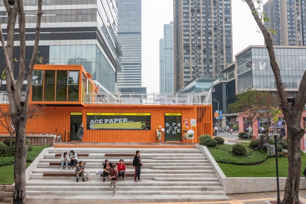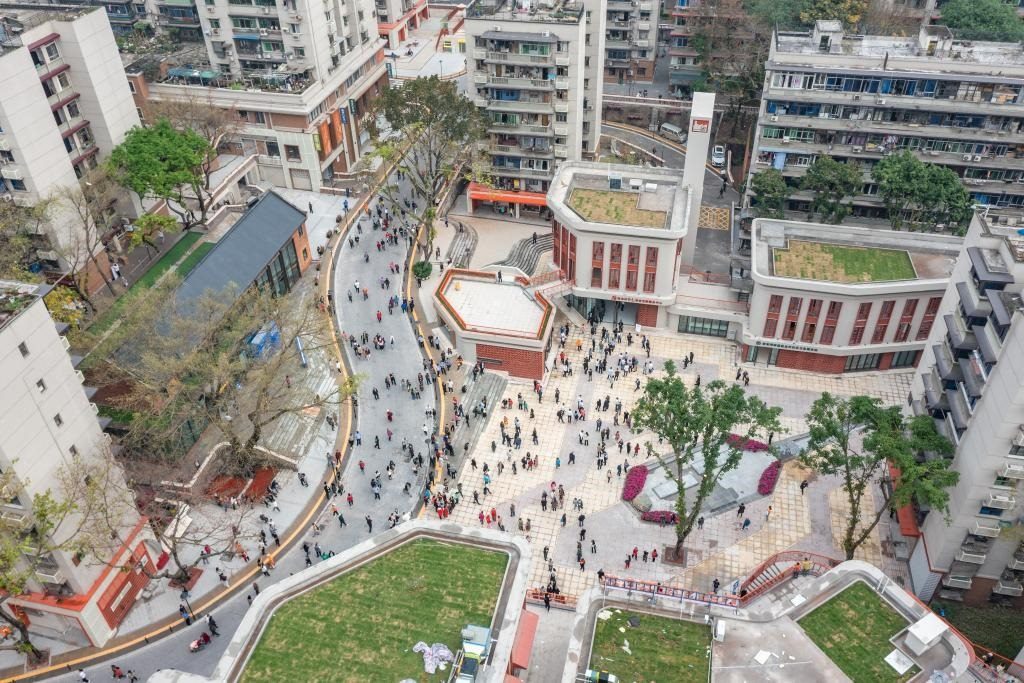 2023年4月28日,在竣工亮相的民主村片區(qū)城市更新項(xiàng)目(一期),人們在一處公共空間休息(無人機(jī)照片)。