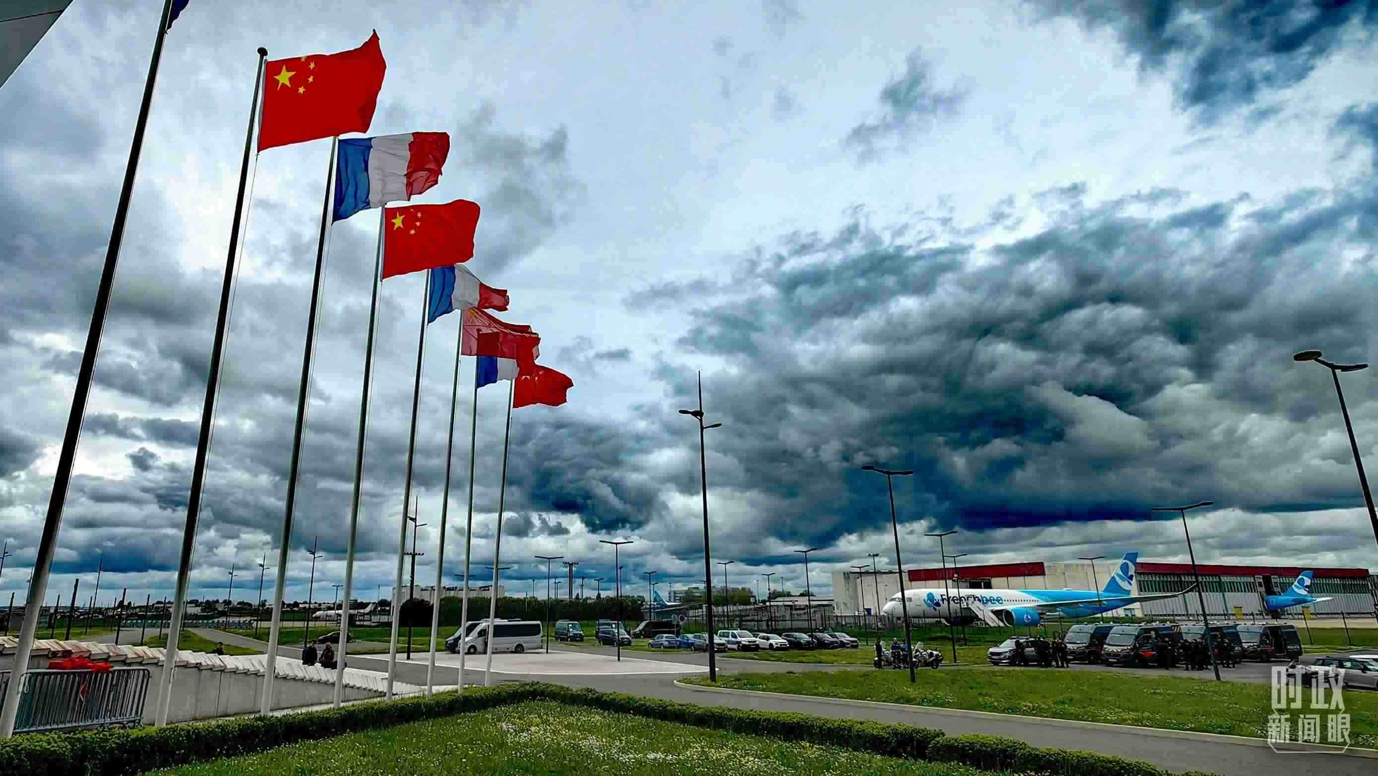 △巴黎奧利機(jī)場(chǎng),中法兩國(guó)國(guó)旗迎風(fēng)招展。(總臺(tái)央視記者段德文拍攝)