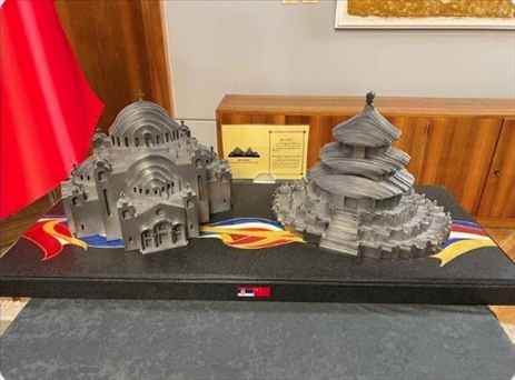習近平主席送給武契奇兩件工藝品,分別是鋼材質(zhì)的天壇和圣薩瓦教堂造型。