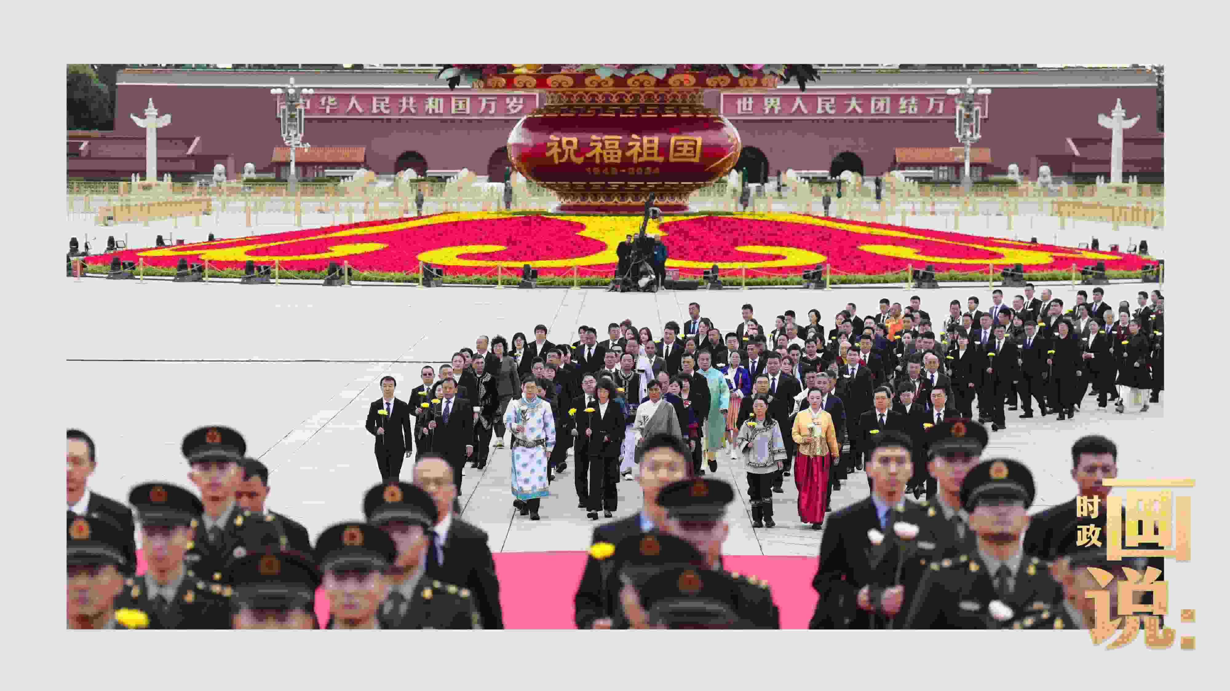 △天安門廣場中央,“祝福祖國”巨型花籃表達(dá)著對(duì)國家繁榮富強(qiáng)的美好祝福。