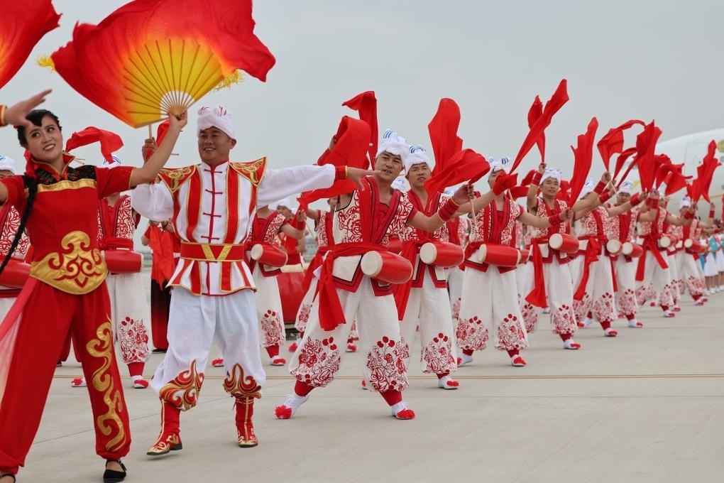 2023年5月17日下午,出席中國-中亞峰會的哈薩克斯坦總統(tǒng)托卡耶夫抵達陜西省西安市。當?shù)孛癖娨詿崆榈难?、歡快的秧歌等民間藝術(shù)表演歡迎貴賓到來。新華社記者 邢廣利 攝