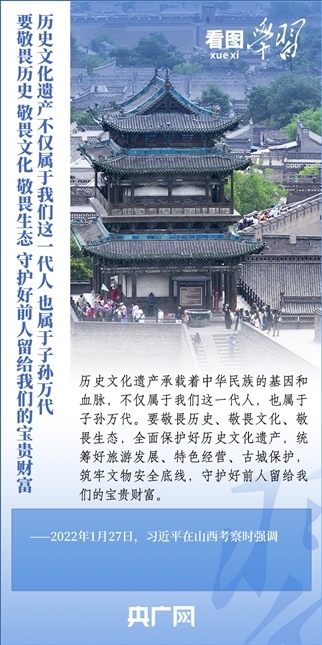 文化遺產(chǎn)是中華優(yōu)秀傳統(tǒng)文化的重要載體,承載著中華民族的基因和血脈。做好歷史文化遺產(chǎn)保護傳承工作,習(xí)近平總書記強調(diào),要統(tǒng)籌好旅游發(fā)展、特色經(jīng)營、古城保護,筑牢文物安全底線,守護好前人留給我們的寶貴財富。