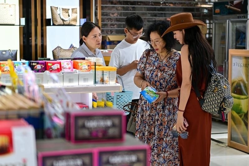 △2024年7月26日,在中哈霍爾果斯國(guó)際邊境合作中心,游客在免稅店挑選商品。今年以來,新疆各大旅游目的地游客量持續(xù)攀升。