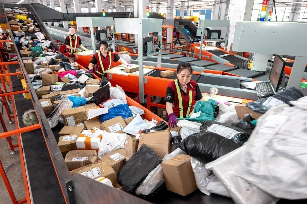 △截至6月30日,今年上半年我國(guó)快遞業(yè)務(wù)量突破800億件,比2023年提前59天。圖為2024年6月18日,在浙江湖州市長(zhǎng)興縣一家快遞企業(yè),工作人員忙著分揀、掃描出庫(kù)等工作。