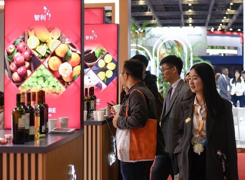 △2024年11月7日,觀眾在第七屆進博會國家展上的智利館了解智利紅酒。