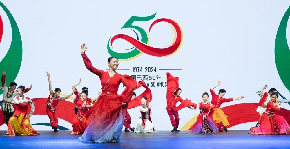 △當(dāng)?shù)貢r間2024年8月15日,在巴西首都巴西利亞,來自北京舞蹈學(xué)院民族舞團的演員在慶祝中巴建交50周年招待會上表演。