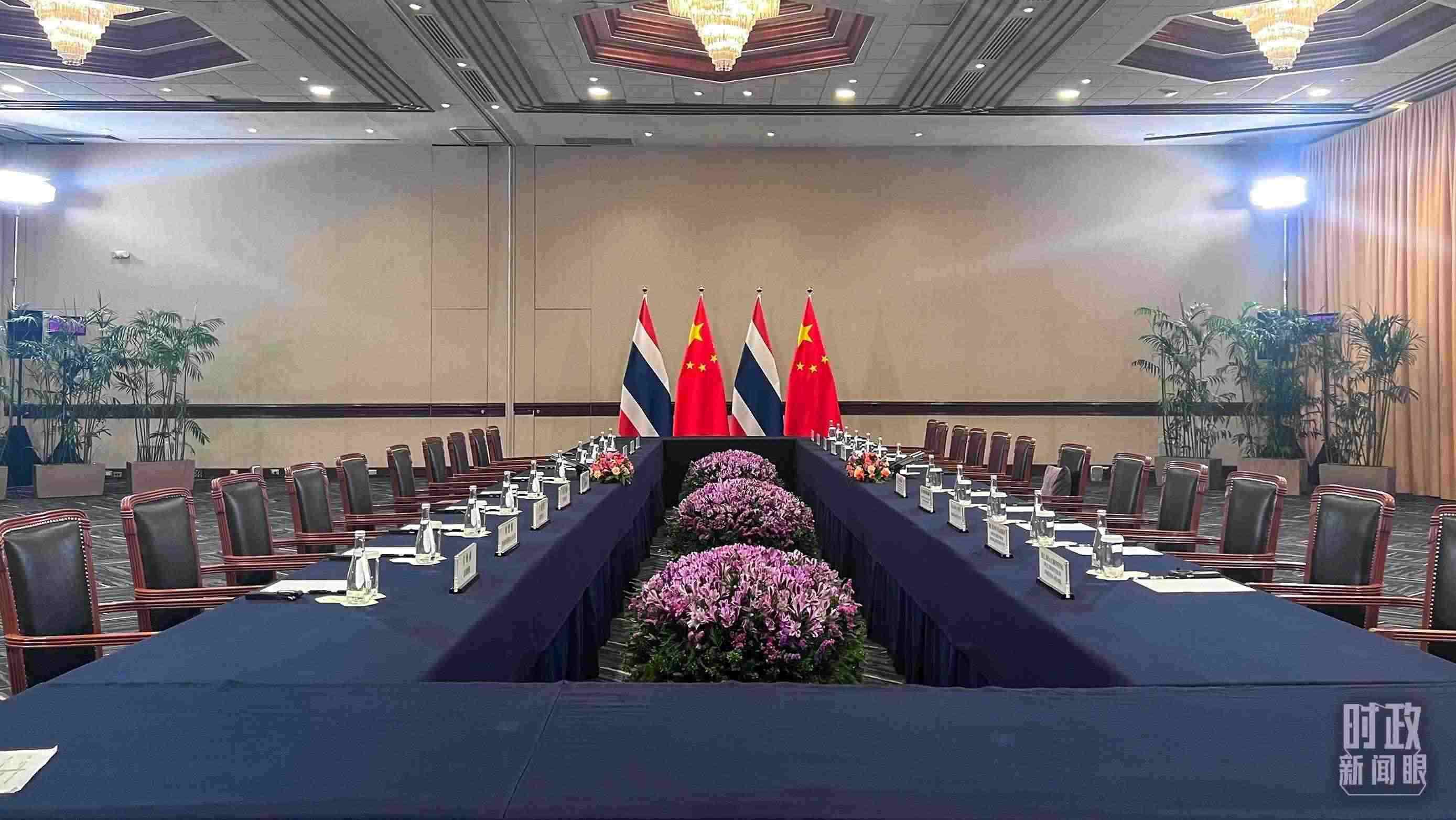 △會(huì)見(jiàn)現(xiàn)場(chǎng)的中泰兩國(guó)國(guó)旗。(總臺(tái)央視記者范一鳴拍攝)