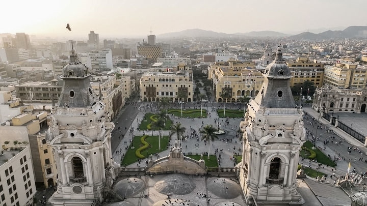 這是10月13日拍攝的秘魯首都利馬武器廣場(chǎng)(無人機(jī)照片)。新華社記者 李木子 攝