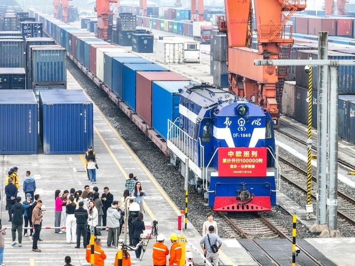11月15日上午10時20分,重慶團結(jié)村中心站。隨著X8083次中歐班列(重慶—杜伊斯堡)從站臺緩緩駛出,中歐班列累計開行突破10萬列。