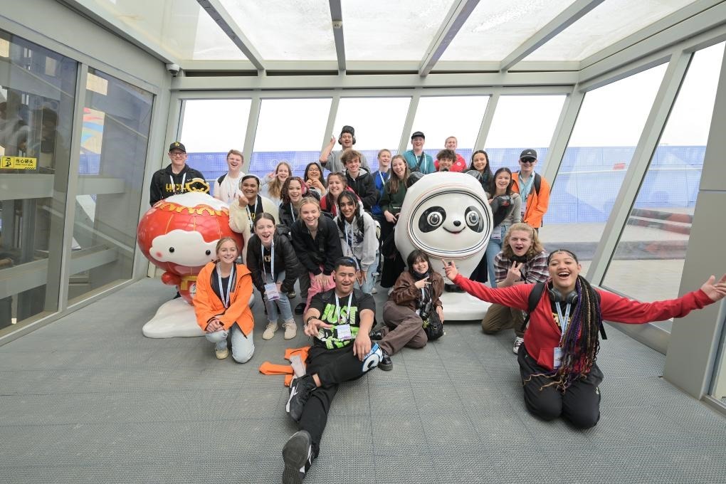 2024年3月21日,美國華盛頓州中學(xué)生代表團(tuán)的成員在首鋼滑雪大跳臺(tái)上與冰墩墩、雪容融合影。新華社記者 李鑫 攝