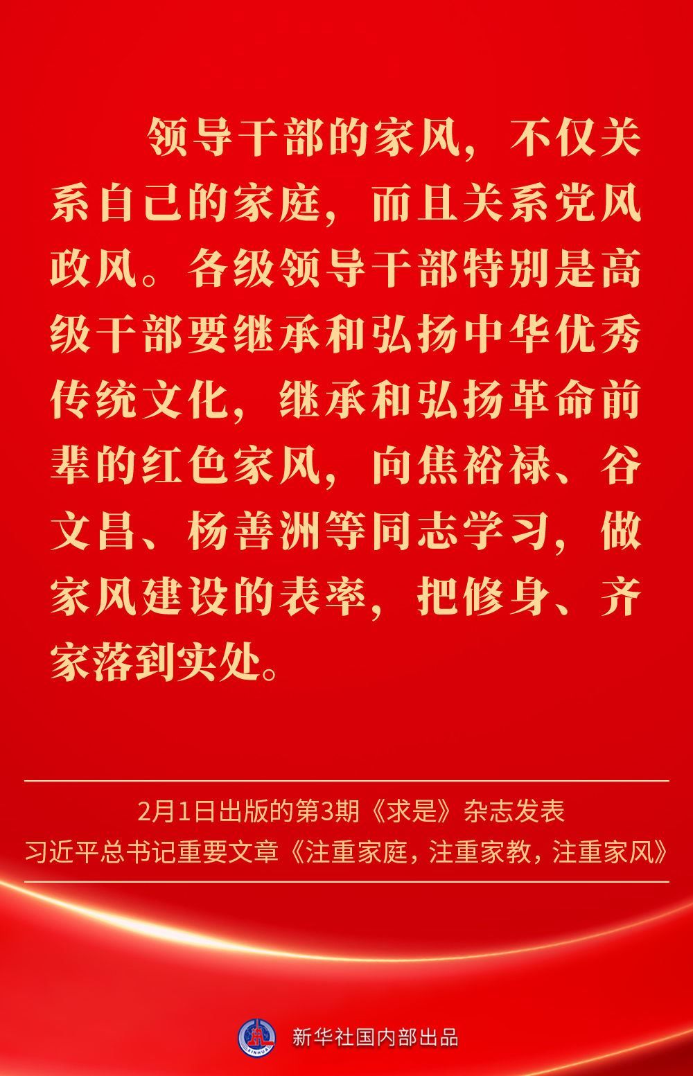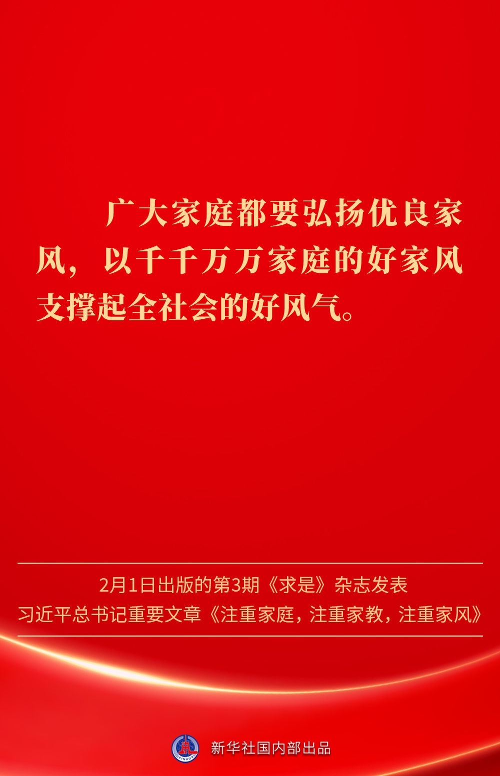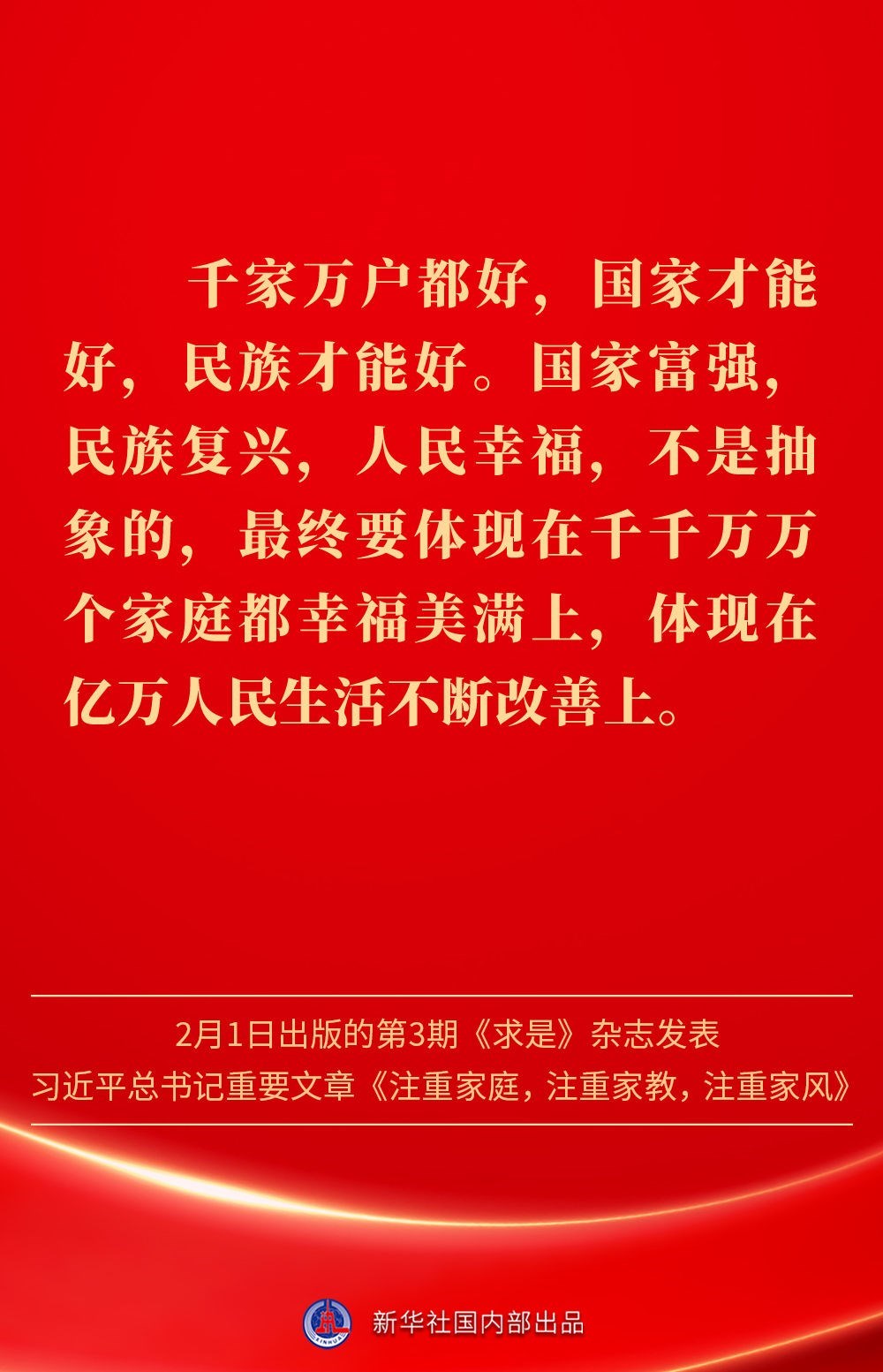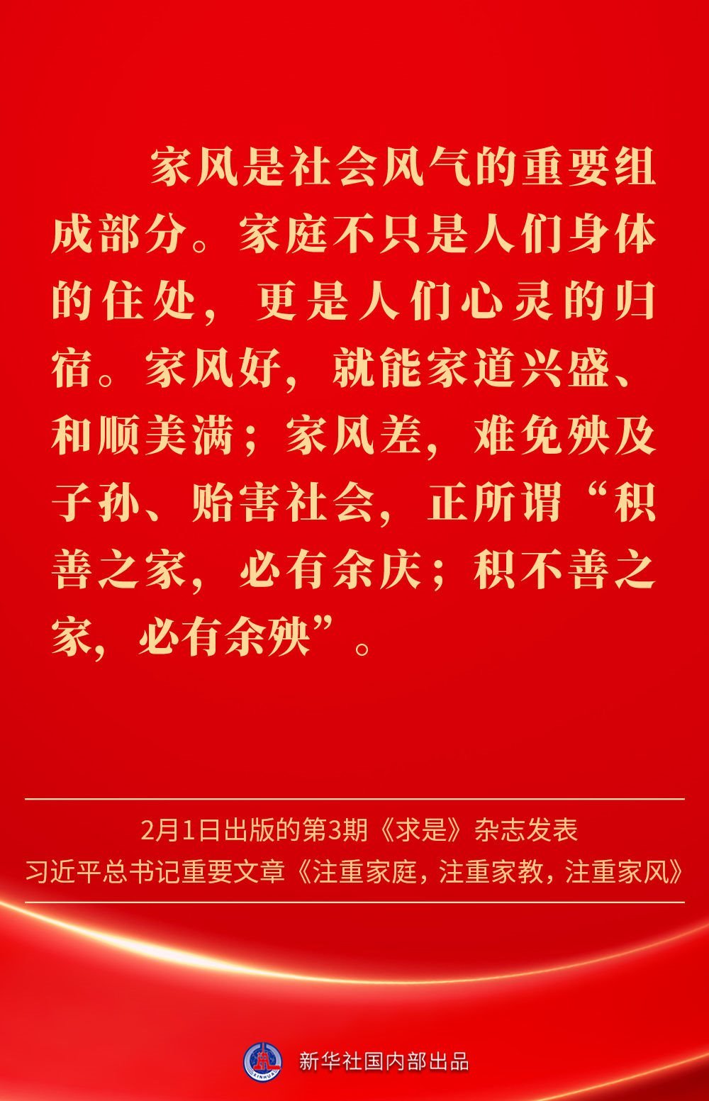 萬家團(tuán)圓共慶新春佳節(jié)之際,2月1日出版的第3期《求是》雜志發(fā)表習(xí)近平總書記重要文章《注重家庭,注重家教,注重家風(fēng)》。為什么要注重家庭、家教、家風(fēng)?如何做好家庭文明建設(shè)?習(xí)近平總書記這樣闡述——