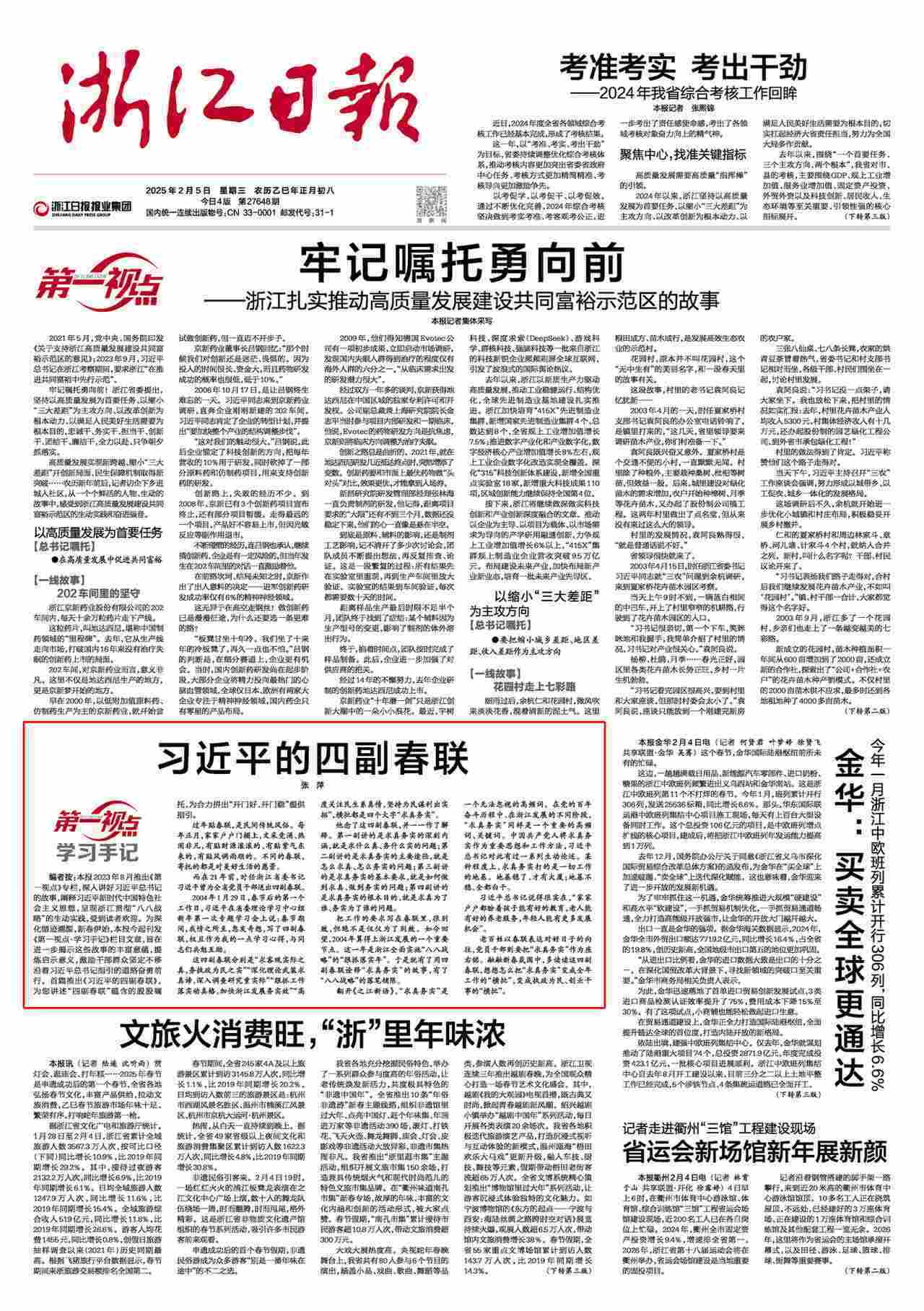 2004年1月29日,春節(jié)后的第一個(gè)工作日,習(xí)近平在省委理論學(xué)習(xí)中心組新年第一次專題學(xué)習(xí)會(huì)上說(shuō):春節(jié)期間,我情之所至,忽發(fā)奇想,寫了四副春聯(lián),權(quán)且作為我的一點(diǎn)學(xué)習(xí)心得,與同志們共勉互勵(lì)。