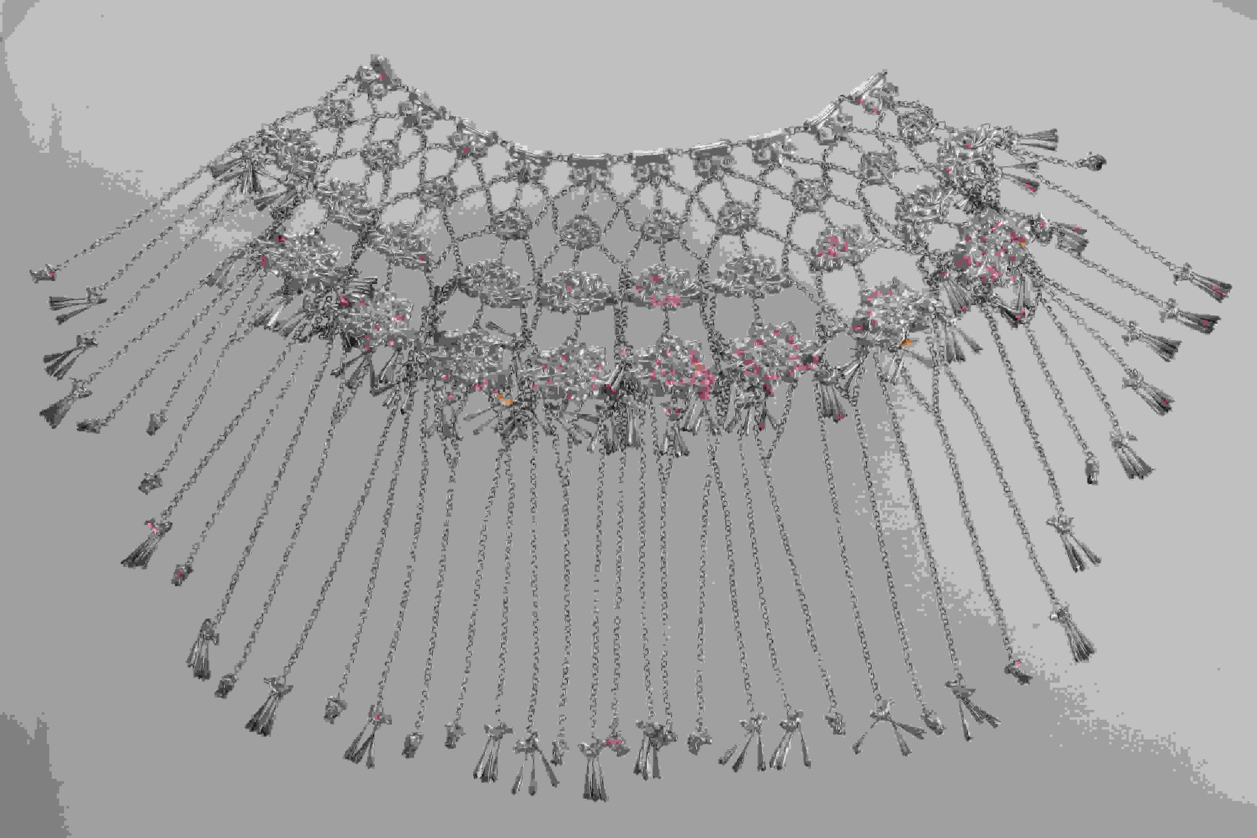 花草 、動(dòng)物等吉祥圖案的4排銀牌相綴連