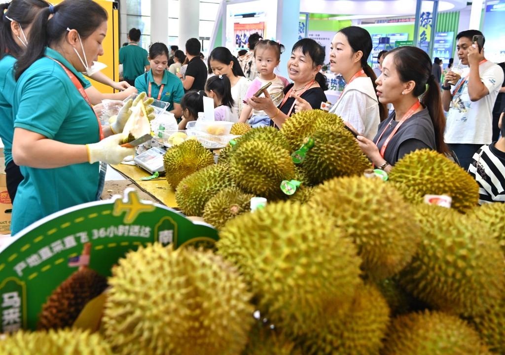 2024年9月28日,觀眾在中國(guó)-東盟博覽會(huì)上挑選馬來西亞榴蓮。新華社記者周華攝