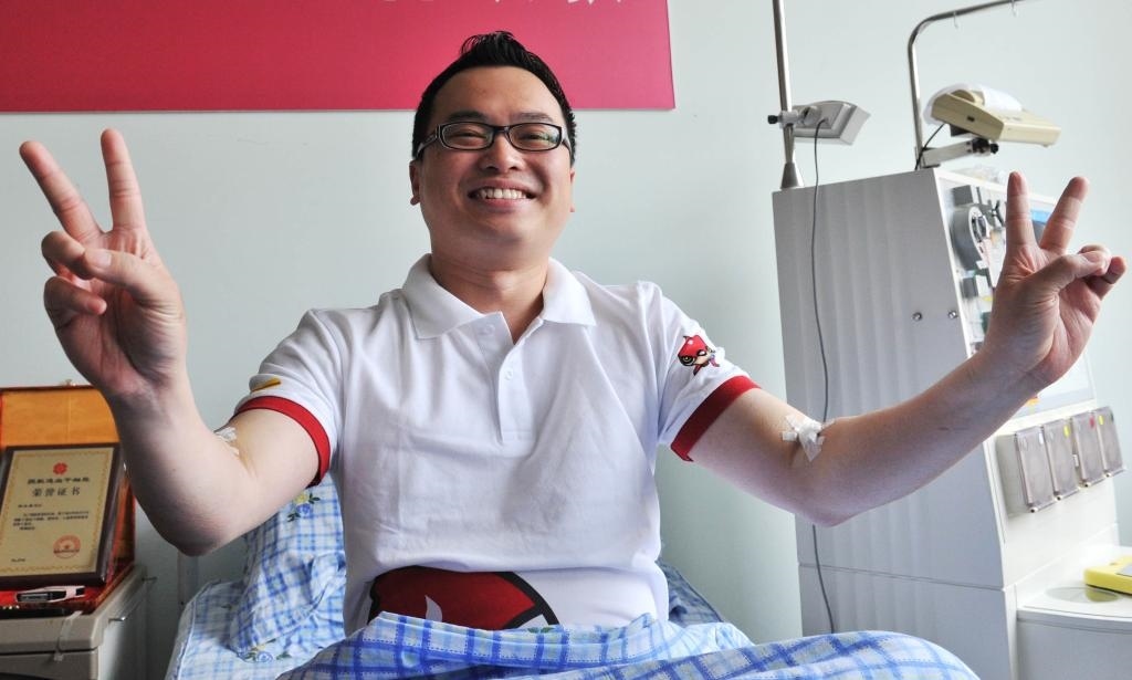 2012年4月17日,馬來西亞青年楊永康在造血干細(xì)胞采集結(jié)束后打出勝利的手勢(shì)。新華社記者岳月偉攝