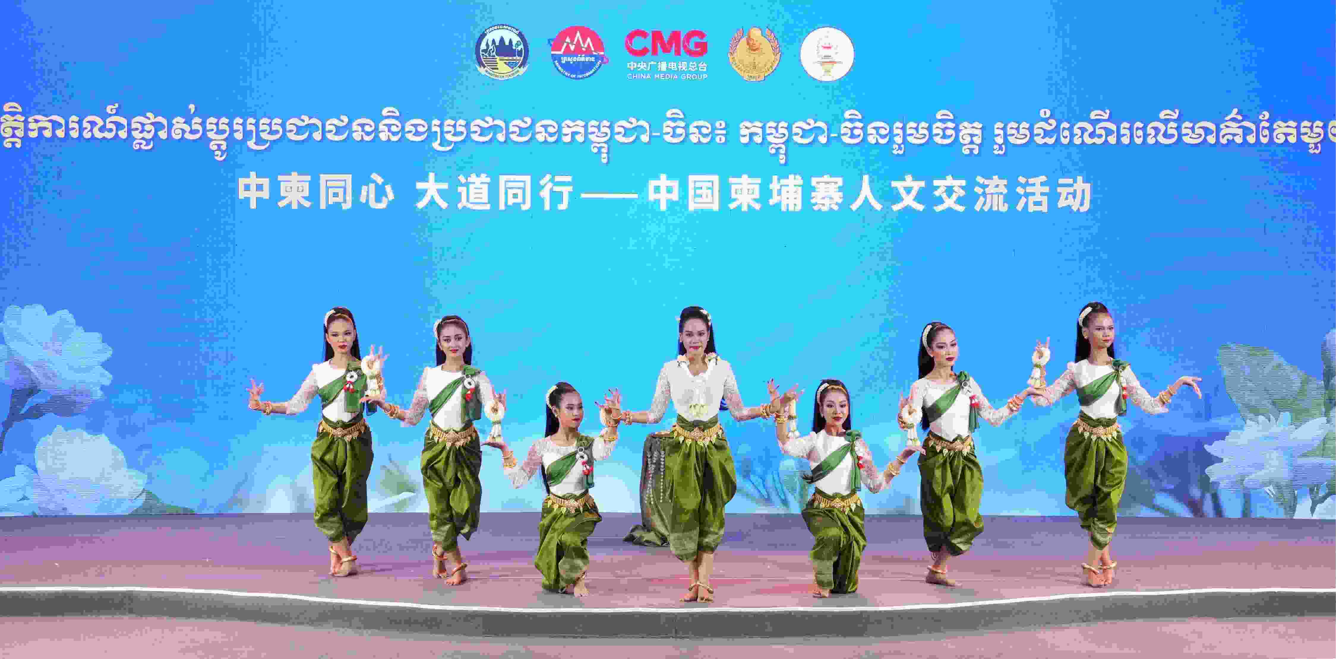 △2025年4月17日,“中柬同心 大道同行——中國柬埔寨人文交流活動”現(xiàn)場,來自柬埔寨帕花黛維公主舞蹈學(xué)校的師生代表在中國民歌《茉莉花》的旋律中表演柬埔寨傳統(tǒng)舞蹈。