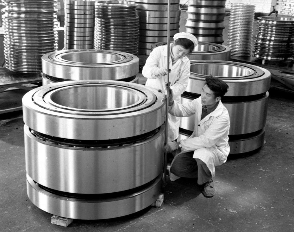 1966年,洛陽軸承廠檢驗員在細心檢查即將出廠的一批特大型軸承的質量。