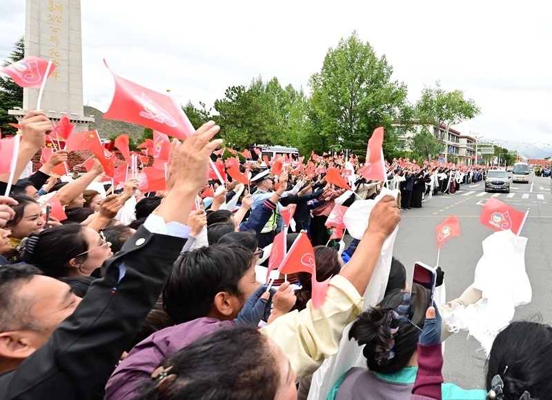 8月20日中午,中共中央總書記、國家主席、中央軍委主席習(xí)近平率中央代表團(tuán)乘專機(jī)抵達(dá)拉薩,出席西藏自治區(qū)成立60周年慶?;顒?。習(xí)近平等從機(jī)場乘車到住地途中,各族群眾在街道兩旁熱情歡迎。