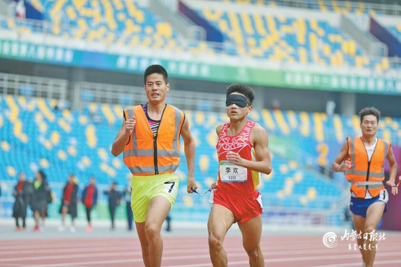 10月27日,內(nèi)蒙古盲人運動員李歡同他的領(lǐng)跑員楊愛瑞獲得男子800米t11級銅牌。