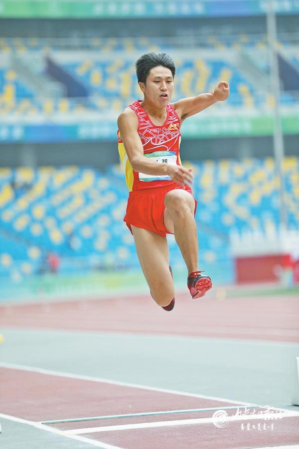 10月25日,內(nèi)蒙古運動員趙強在跳遠(yuǎn)比賽上奮力一跳。