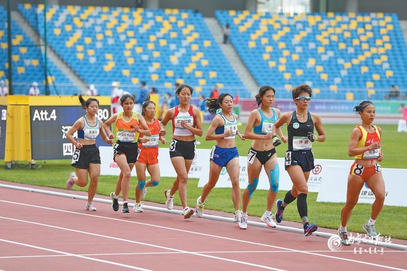 10月23日,內(nèi)蒙古運動員姜迎弟(左三)在女子萬米聽障比賽中與各路高手角逐。