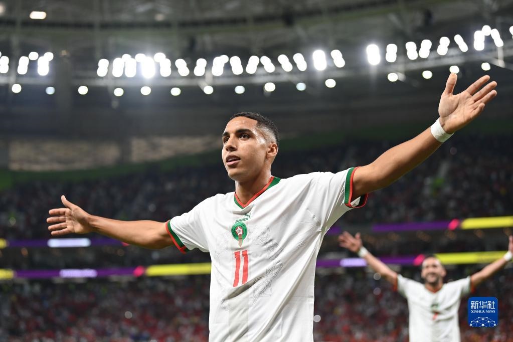 11月27日,摩洛哥隊球員阿布赫拉爾(右二,14號)打入球隊第二粒進球。新華社記者 徐子鑒 攝