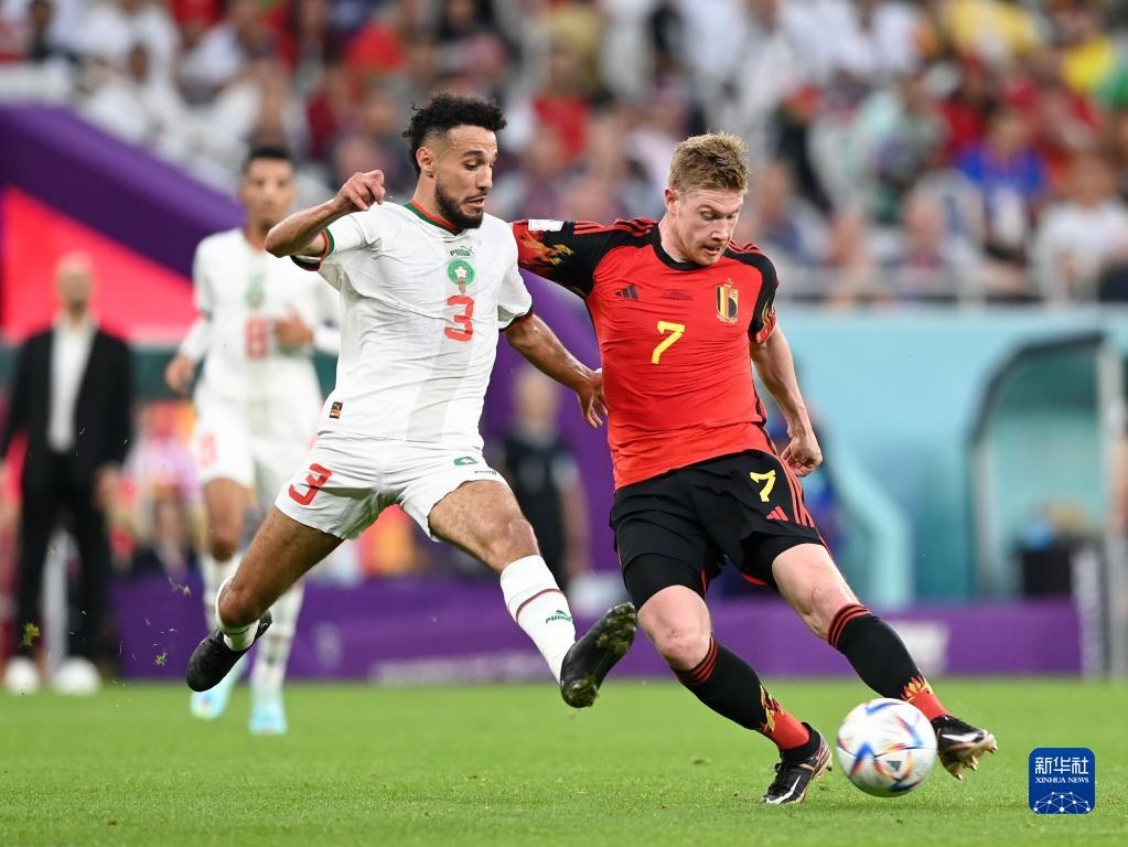 11月27日,比利時隊球員德布勞內(右)與摩洛哥隊球員馬茲拉維拼搶。新華社記者 李俊東 攝