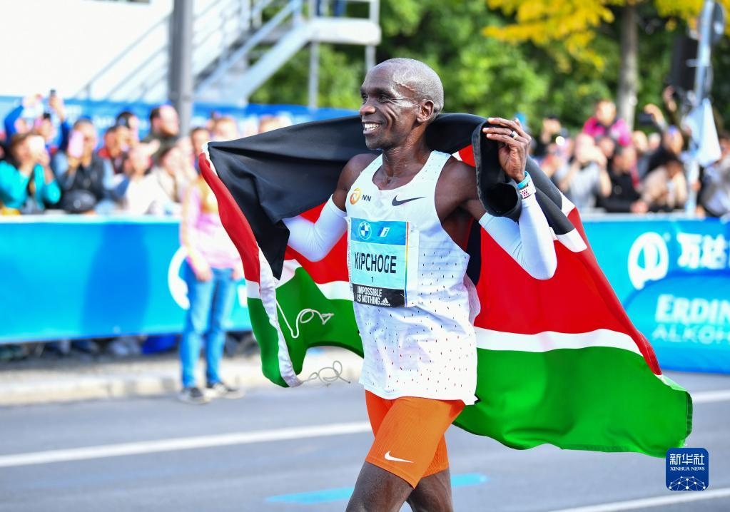 這是2022年9月25日,基普喬格在2022年柏林馬拉松賽奪冠后慶祝。新華社記者 任鵬飛 攝