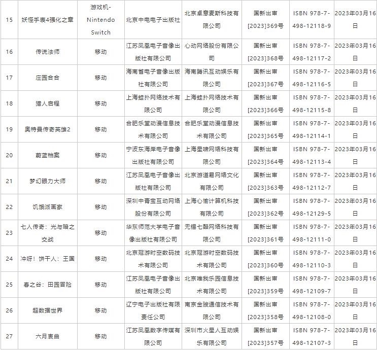 人民網(wǎng)北京3月21日電 (記者楊虞波羅)據(jù)國家新聞出版署官網(wǎng)消息,3月20日,2023年進口網(wǎng)絡(luò)游戲?qū)徟畔⒄桨l(fā)布,共27款游戲獲得游戲版號,其中包含22款移動游戲、3款PC游戲、1款雙端游戲、1款NS游戲機游戲。