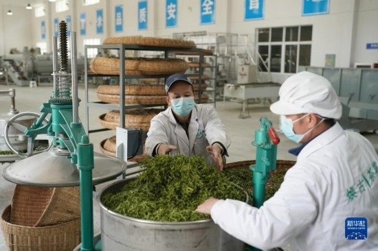 4月6日,工作人員在紫陽(yáng)縣煥古鎮(zhèn)一家茶企車間內(nèi)工作。