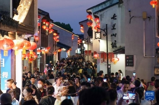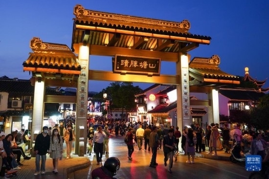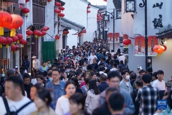 游客在江蘇蘇州山塘街休閑游玩(4月10日攝)。