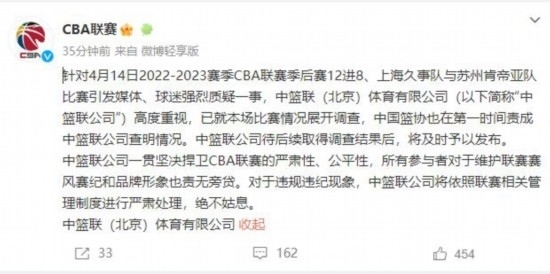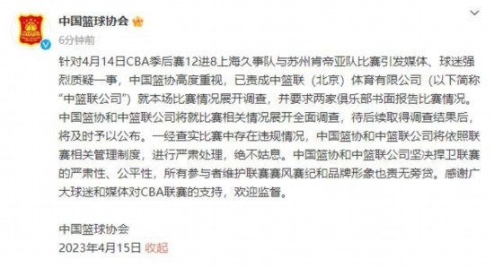 CBA聯(lián)賽官方微博15日凌晨發(fā)布消息表示:針對4月14日2022-2023賽季CBA聯(lián)賽季后賽12進8、上海久事隊與蘇州肯帝亞隊比賽引發(fā)媒體、球迷強烈質(zhì)疑一事,中籃聯(lián)(北京)體育有限公司(以下簡稱“中籃聯(lián)公司”)高度重視,已就本場比賽情況展開調(diào)查,中國籃協(xié)也在第一時間責(zé)成中籃聯(lián)公司查明情況。中籃聯(lián)公司待后續(xù)取得調(diào)查結(jié)果后,將及時予以發(fā)布。