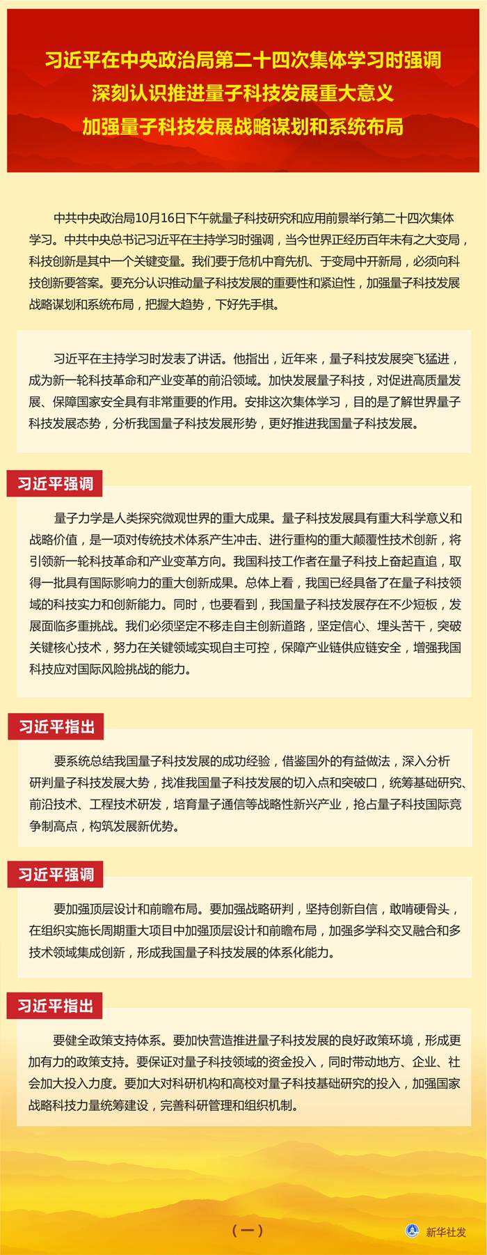 新華社北京10月17日電 中共中央政治局10月16日下午就量子科技研究和應(yīng)用前景舉行第二十四次集體學(xué)習(xí)。中共中央總書記習(xí)近平在主持學(xué)習(xí)時(shí)強(qiáng)調(diào),當(dāng)今世界正經(jīng)歷百年未有之大變局,科技創(chuàng)新是其中一個(gè)關(guān)鍵變量。我們要于危機(jī)中育先機(jī)、于變局中開新局,必須向科技創(chuàng)新要答案。要充分認(rèn)識(shí)推動(dòng)量子科技發(fā)展的重要性和緊迫性,加強(qiáng)量子科技發(fā)展戰(zhàn)略謀劃和系統(tǒng)布局,把握大趨勢(shì),下好先手棋。