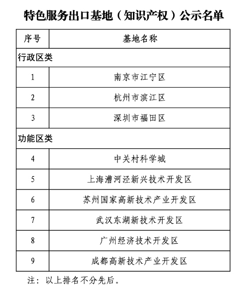 據(jù)國(guó)家知識(shí)產(chǎn)權(quán)局官網(wǎng)消息,根據(jù)《商務(wù)部等7部門辦公廳(室)關(guān)于組織申報(bào)專業(yè)類特色服務(wù)出口基地的通知》(商辦服貿(mào)函〔2021〕355號(hào))要求,經(jīng)地方申報(bào)、省市知識(shí)產(chǎn)權(quán)和商務(wù)主管部門初審?fù)扑]、第三方機(jī)構(gòu)客觀指標(biāo)評(píng)審、專家評(píng)審、部門工作組復(fù)核等程序,初步認(rèn)定知識(shí)產(chǎn)權(quán)服務(wù)出口基地9家,名單于2月7日-2月11日進(jìn)行公示。