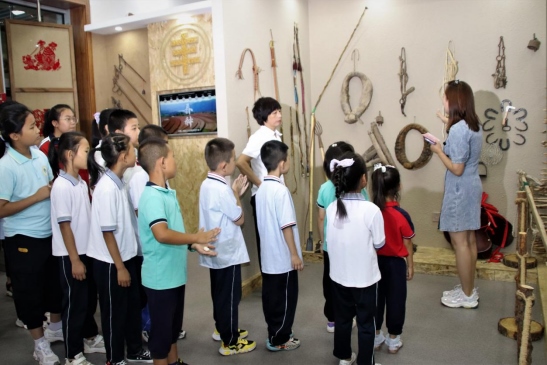 這里的一件件農(nóng)具、生活用品等都是祖輩們生產(chǎn)生活的必需品,就是這些簡陋粗糙的物件,浸透了他們的斑斑汗跡和聰明智慧。在館外主要展示了大型農(nóng)耕工具、生活日常用品等,并在農(nóng)具認知課程過程中,教孩子們了解怎樣使用石磨、風車、釘耙、犁、簸箕、扁擔等農(nóng)具。