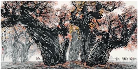 梁先生曾旅居西藏四個(gè)月,不僅為人民大會(huì)堂西藏廳創(chuàng)作了巨幅國畫《雪山雄鷹》,同時(shí)收獲了數(shù)百張速寫和寫生稿。他還四上黃山,兩次到三峽。2000年,70多歲的梁世雄又深入新疆無人區(qū)胡楊林中進(jìn)行素材收集。此后,大漠胡楊成了梁世雄作品新的視覺符號。