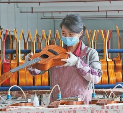 從第一家吉他企業(yè)落戶正安吉他文化產(chǎn)業(yè)園起,經(jīng)過10年的發(fā)展,園區(qū)內(nèi)目前年產(chǎn)銷吉他超過600萬把,約占全國吉他產(chǎn)量的1/5?!叭绻麊胃慵圃?,我們的產(chǎn)業(yè)會(huì)局限在工業(yè)領(lǐng)域?!闭部h委宣傳部副部長楊安輝說,從2016年起,正安就開始著手吉他文化的培育、推廣和普及,延長吉他產(chǎn)業(yè)鏈。