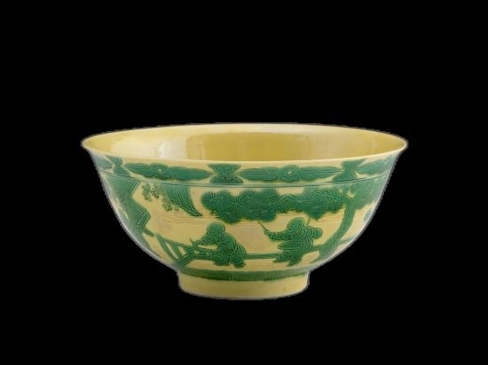 清同治·景德鎮(zhèn)窯黃地綠釉嬰戲圖碗。色地彩瓷是以各種不同的顏色釉為地,再施一種彩為飾,各種色彩互相交錯(cuò)使用,形成“一地一彩”的瓷器,如黃地綠彩、綠地紫彩、綠地黃彩、紅地黃彩、紫地綠彩等多種色地彩瓷。屬低溫彩釉,最早在明代永樂時(shí)期出現(xiàn)。(圖片來源:上海博物館)