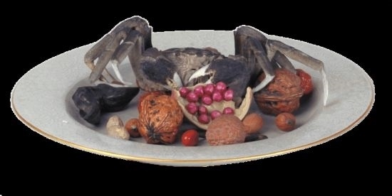 清乾隆·粉彩像生瓷果品盤。盤中諸果品不但酷似實(shí)物,而且都具有吉祥含義,如螃蟹寓意“一甲”,即科舉殿試第一;荔枝樹有“經(jīng)四百余年猶能結(jié)實(shí)者”之說,象征長(zhǎng)壽;核桃、石榴是多子多福的象征;而棗、花生、瓜子等則寓意“早生貴子”。(圖片來源:故宮博物院)