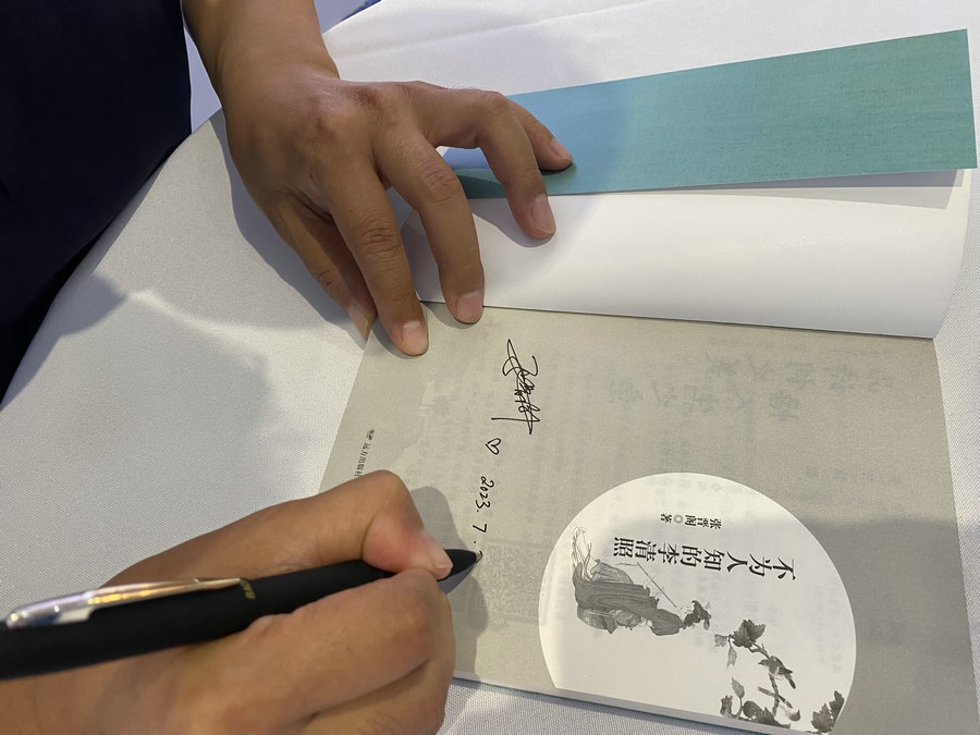 圍繞某些宋人作品中記載的李清照“流落以死”、李清照卒年的多版本說法、李清照的詩詞風(fēng)格為什么會從婉約轉(zhuǎn)變到豪放等“疑點”,張晉閣先生為大家講述了《不為人知的李清照》的寫作緣由、研究經(jīng)歷、文字表達形式和內(nèi)心希冀。隨后,兩位讀者分別提出“您最喜歡李清照的哪一首詩詞”、“對李清照的寫作產(chǎn)生深遠影響的人是誰”這兩個問題,張晉閣先生分享了自己的看法并朗誦了優(yōu)美的詩詞佳作,現(xiàn)場交流、互動氣氛熱烈?;顒咏Y(jié)束后,張晉閣先生為讀者朋友們簽名留念。多位年輕讀者表示,通過閱讀《不為人知的李清照》,加深了他們對古典詩詞的喜愛。