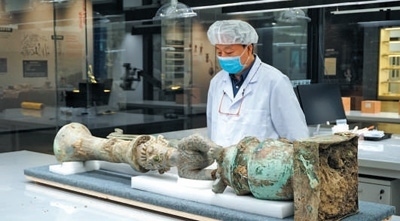 文物修復(fù)四川省文物考古研究院三星堆遺址工作站站長雷雨在查看拼對成功的鳥足曲身頂尊神像。新華社記者 肖 林攝