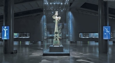 陳列展覽三星堆博物館展出的青銅大立人,旁邊采用多媒體技術(shù)展示其服飾與造型解讀。宋豪新 張 艷攝影報道