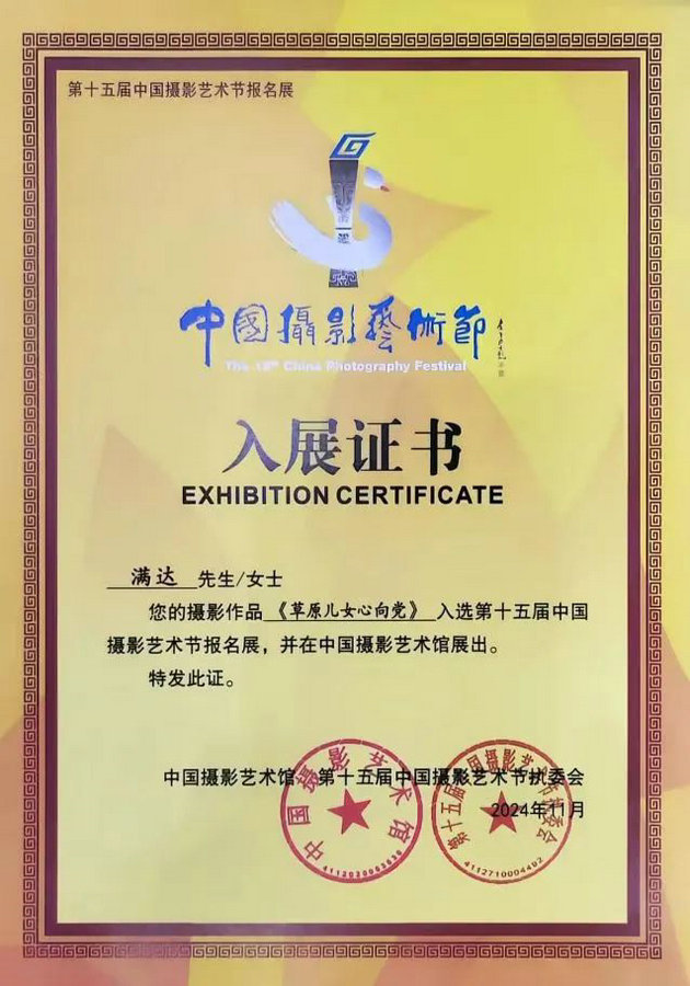 近日,內(nèi)蒙古畫(huà)報(bào)社記者滿(mǎn)達(dá)攝影作品《草原兒女心向黨》入選第十五屆中國(guó)攝影藝術(shù)節(jié)報(bào)名展。