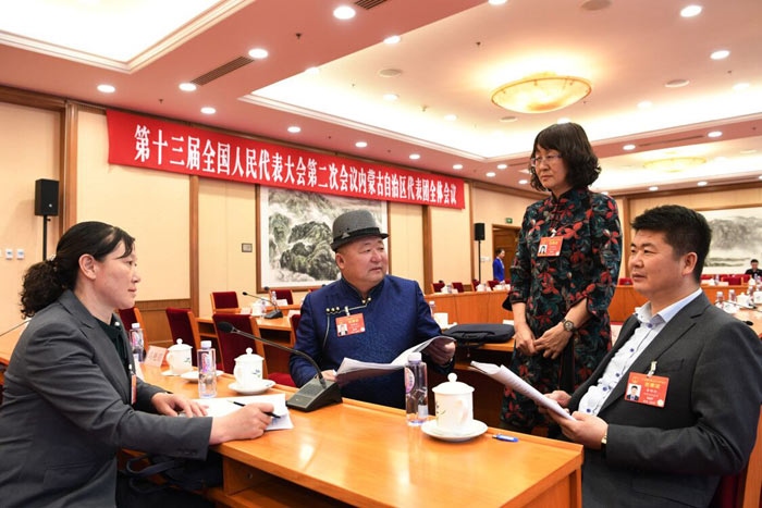 3月12日,內(nèi)蒙古代表團(tuán)的4名基層代表在全團(tuán)會(huì)議結(jié)束后,仍在熱議“兩高”報(bào)告。 內(nèi)蒙古日報(bào)社融媒體記者 袁永紅 攝