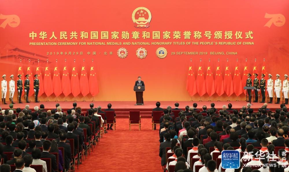 ↑9月29日,中華人民共和國(guó)國(guó)家勛章和國(guó)家榮譽(yù)稱號(hào)頒授儀式在北京人民大會(huì)堂金色大廳隆重舉行。中共中央總書(shū)記、國(guó)家主席、中央軍委主席習(xí)近平向國(guó)家勛章和國(guó)家榮譽(yù)稱號(hào)獲得者頒授勛章獎(jiǎng)?wù)虏l(fā)表重要講話。新華社記者黃敬文攝