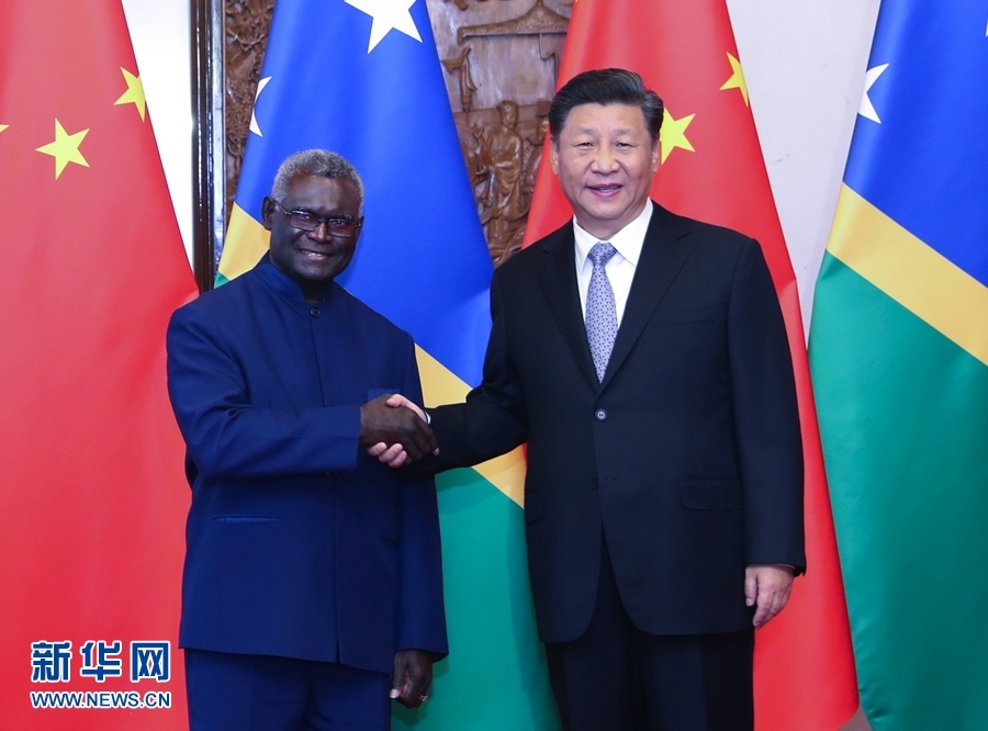 10月9日,國家主席習(xí)近平在北京釣魚臺(tái)國賓館會(huì)見所羅門群島總理索加瓦雷。
