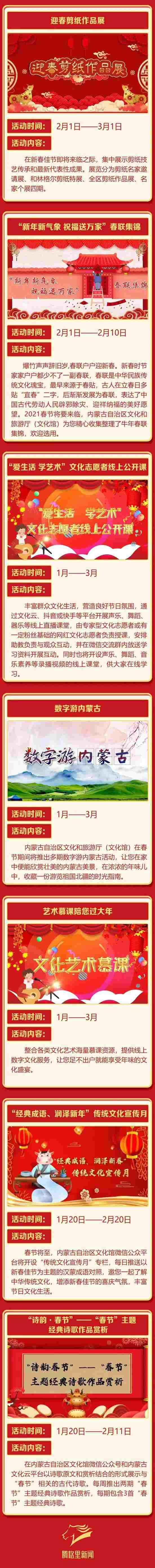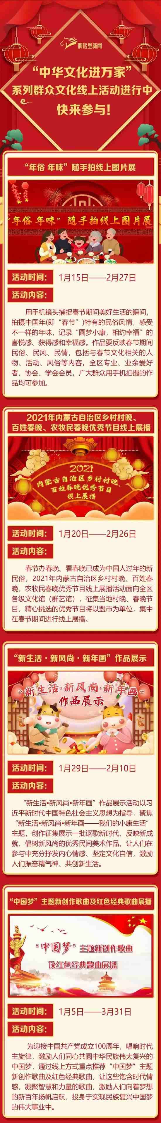 2021年春節(jié)的腳步越來(lái)越近,為豐富春節(jié)期間廣大群眾的精神文化生活,營(yíng)造歡樂(lè)、團(tuán)圓、喜慶、祥和的節(jié)日氛圍,內(nèi)蒙古自治區(qū)文化和旅游廳(文化館)于2021年1月至3月將推出“中華文化進(jìn)萬(wàn)家”系列群眾文化線(xiàn)上活動(dòng)。