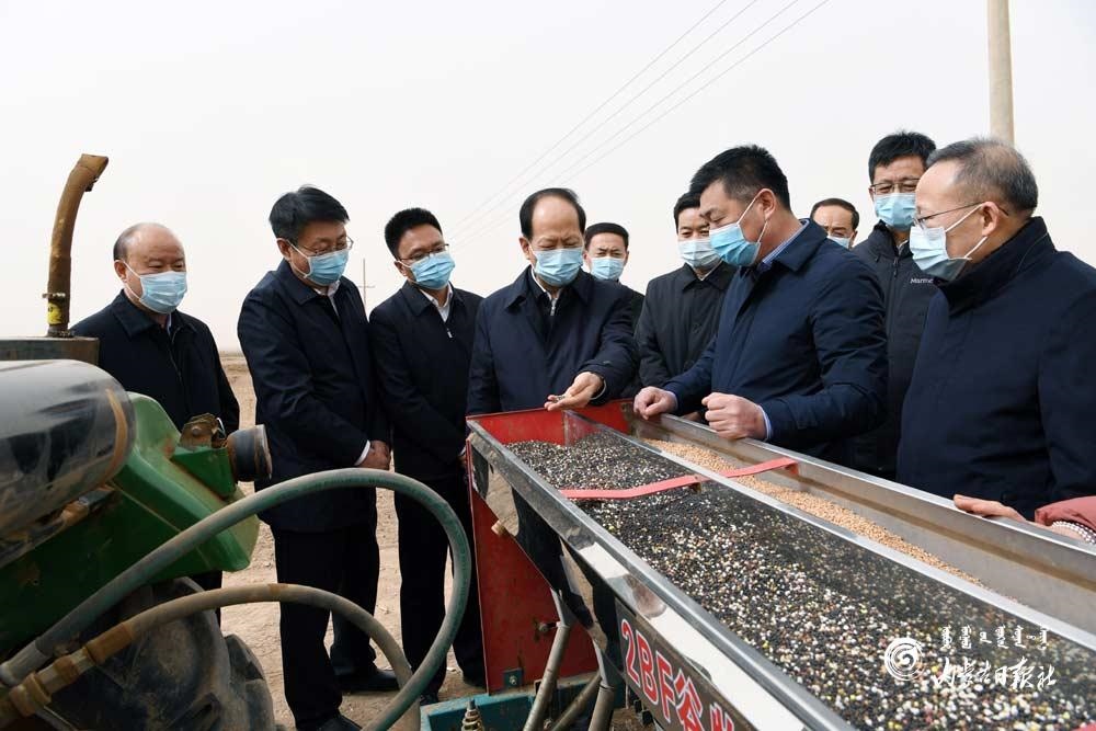驚蟄已過(guò),春耕在即。石泰峰一下飛機(jī)就驅(qū)車來(lái)到臨河農(nóng)場(chǎng)八分場(chǎng),直奔田間地頭,考察春耕備耕情況。在小麥播種現(xiàn)場(chǎng),他與種植戶和當(dāng)?shù)馗刹抗苍掁r(nóng)桑,詳細(xì)了解土壤墑情、測(cè)土施肥、種植結(jié)構(gòu)、糧播面積、春耕資金保障等情況,并與大家一筆筆測(cè)算成本、估算收入。石泰峰說(shuō),當(dāng)前正值農(nóng)業(yè)生產(chǎn)的關(guān)鍵時(shí)期,各地要不違農(nóng)時(shí)地謀劃好組織好各項(xiàng)工作,加強(qiáng)農(nóng)機(jī)、農(nóng)資、種子供應(yīng)儲(chǔ)備,研究搞好市場(chǎng)供需調(diào)度和產(chǎn)銷對(duì)接,為今年糧食豐收和農(nóng)民增收打好基礎(chǔ)。他指出,耕地是最寶貴的資源,我們既要用好耕地,也要采取有效措施護(hù)地養(yǎng)地,推動(dòng)農(nóng)業(yè)可持續(xù)發(fā)展。
